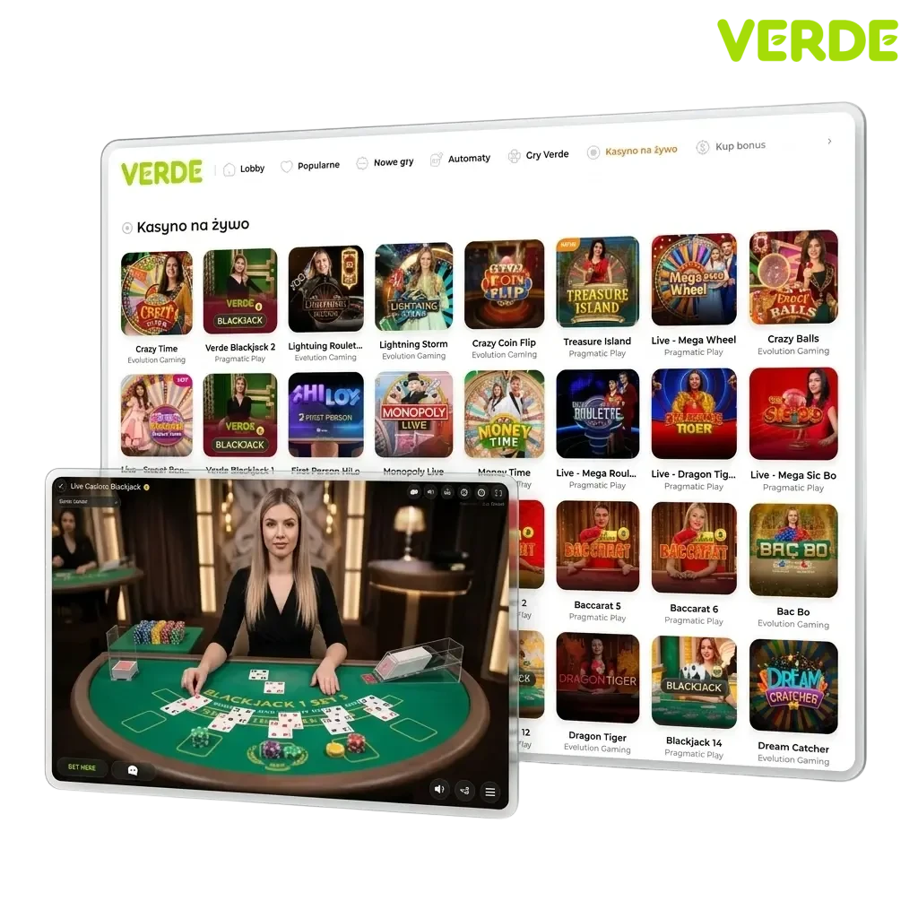 Verde Casino live casino oferuje polskim graczom szeroki wybór tytułów od czołowych dostawców. Poniżej znajdziesz najpopularniejsze gry na żywo dostępne na platformie.